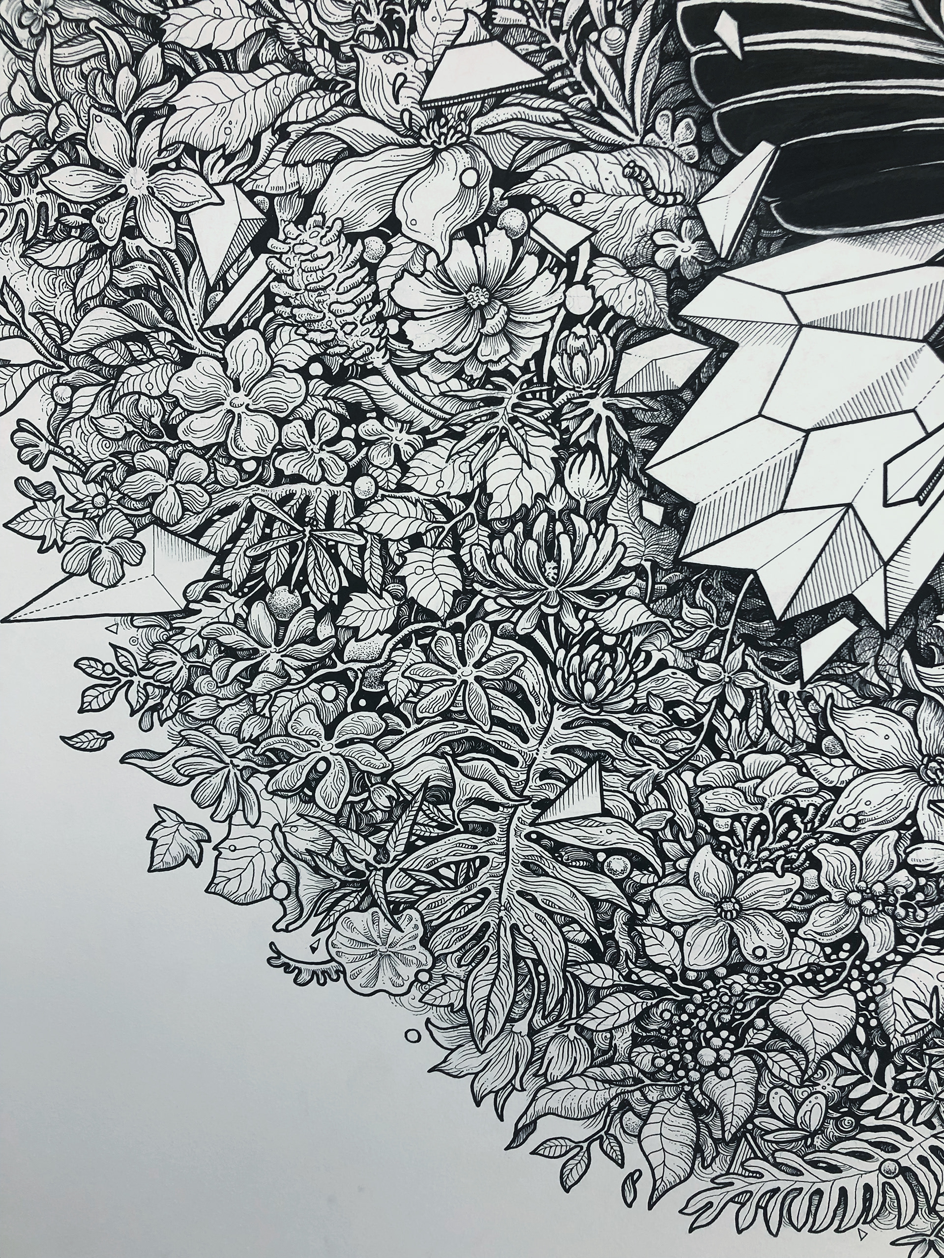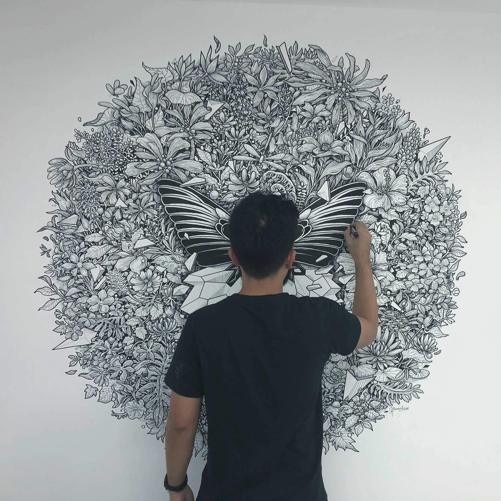 Approved concept sketch featuring the Magellan birdwing (troides magellanus) - a large and striking birdwing butterfly found in the Philippines. The butterfly is escaping its geometric form surrounded by foliage and some local flower species.